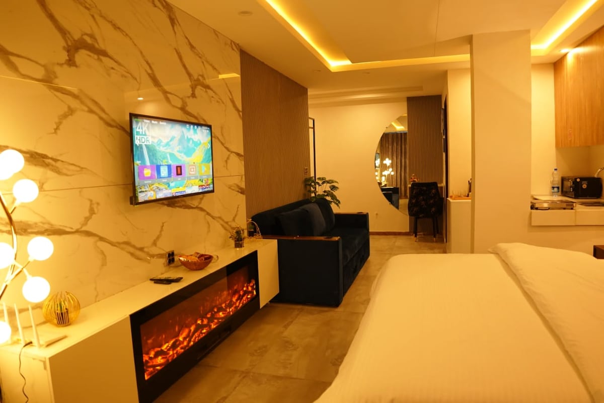 Murree-də Luxe Loft Dəbli 3 Yataqlı Mənzil Aşağı Jhika Qali Yolu, MIT yaxınlığında unikal dizayn edilmiş 3 yataq otaqlı bu mənzildə rahat qonaqlamadan zövq alın. 2 çarpayı, 2 birnəfərlik çarpayı, açıq planlı mətbəx və istirahət otağı, ağıllı televizor, dağ mənzərəli böyük terras, 24/7 təhlükəsizlik, UPS ehtiyat nüsxəsi və pulsuz parkinq. Əlavə ödənişlə mövcud olan aşpaz və sürücü qonaqlaması. Yalnız cütlüklər və ailələr. Jhika Gali Bazaar-a 5 dəqiqə, Mall Road-a 10 dəqiqə.