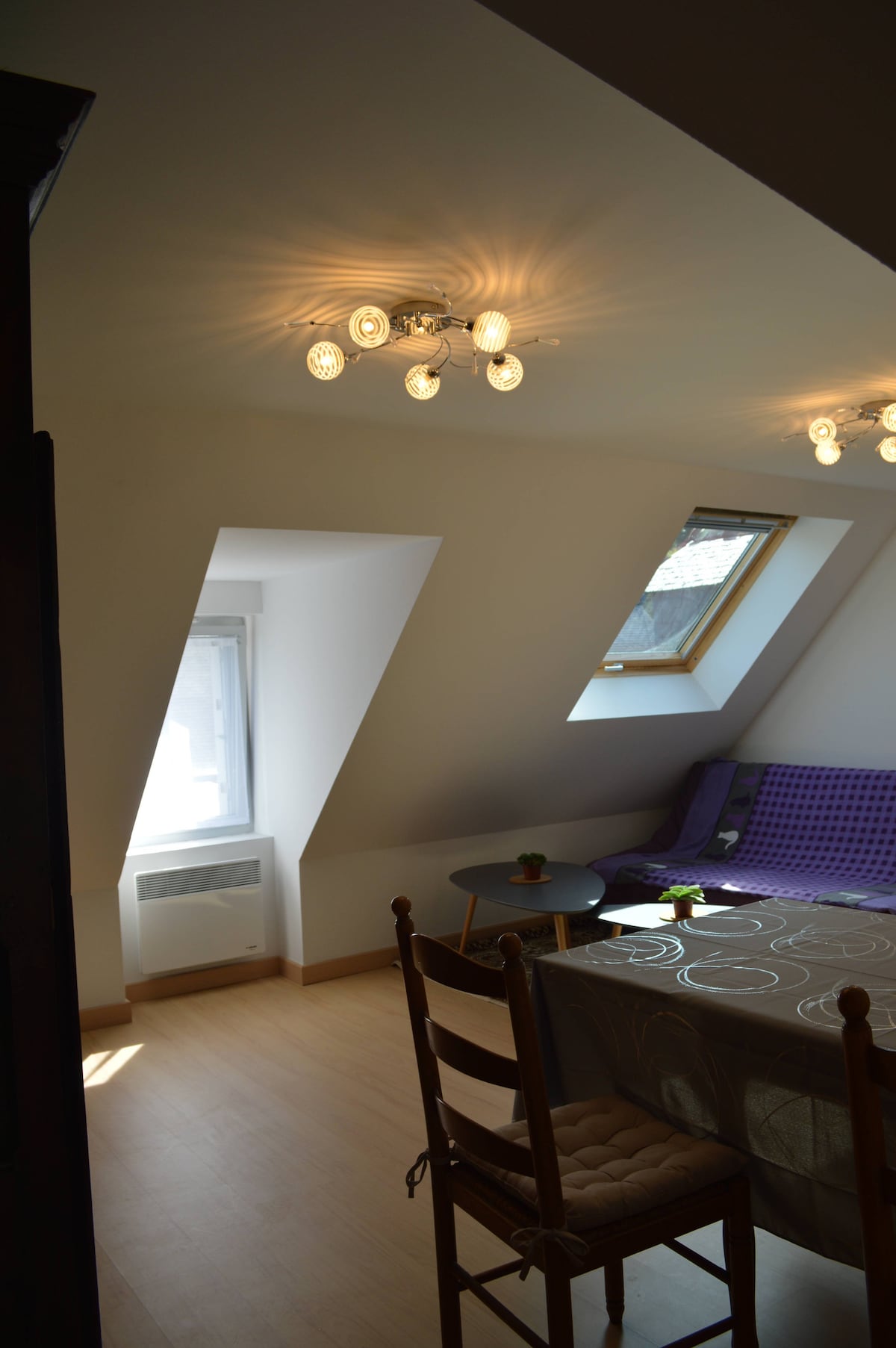 A Pont - Aven ville de renom , citée des peintres et de tant d ' autres choses , l ' appartement Ty Feunten vous accueillera en centre ville ,proches de tous commerces . Cet appartement ,au charme mansardé , situé au second étage d ' une maison individuelle , deviendra votre port d ' attache pour découvrir notre charmante cité ( le port , les rives de l' Aven , les galeries de peintures , le musée refait à neuf , toutes les boutiques vendant les produits régionaux ) et visiter notre belle région