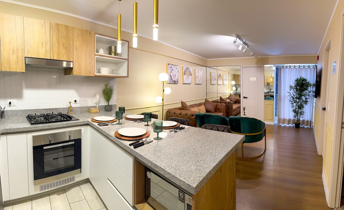 Limanın mərkəzində, bütün istədiyiniz yerlərə asanlıqla gedə biləcəyiniz bu müasir, tam təchiz olunmuş mənzildə rahat, təhlükəsiz və zərif qonaqlamanın zövqünü çıxarın. Əla mövqe və komfort axtaran turistlər, cütlüklər, ailələr və işgüzar səyahətçilər üçün idealdır. Mənzil 24/7 təhlükəsizlik xidməti olan binanın birinci mərtəbəsində yerləşir, bu da yüksək təhlükəsizlik və asan giriş imkanı təmin edir. Həmçinin binanın həm içərisində, həm də çölündə təhlükəsizlik kameraları var.