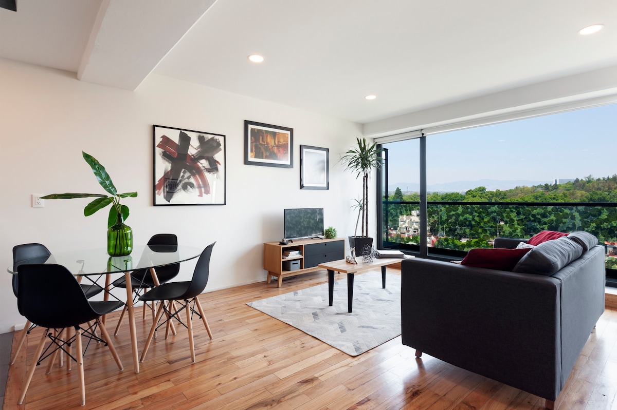 This one of a kind and cozy pent-house is located inside one of the most emblematic developments built in La Condesa neighborhood. Its architecture is a contemporary version of Art Deco. A style that defines La Condesa. It is located in a beautiful, tree-lined area. The atmosphere is very family-oriented, with young and vibrant people. The surroundings invite us to step out, walk, relax and discover new experiences.