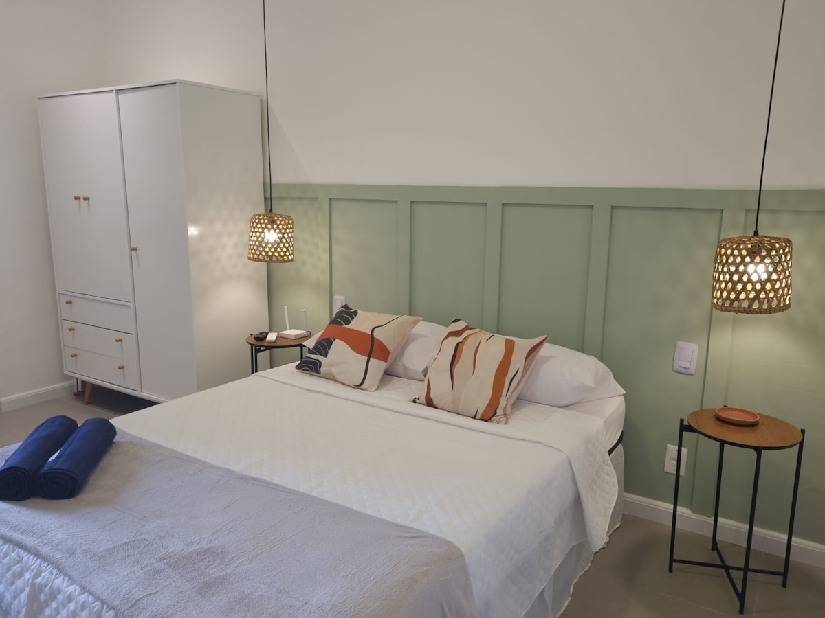 Fully equipped cosy & vast bungalow, small kitchen and gorgeous view, set in a private garden with independent entrance. Our Colonial property is surrounded by a tropical garden and located in a bucolic street in the center of Santa Teresa. It is ideal for a couple but we can ad an extra bed. We also have a small private room up on demand on the same garden area. 40Gb cable Wifi