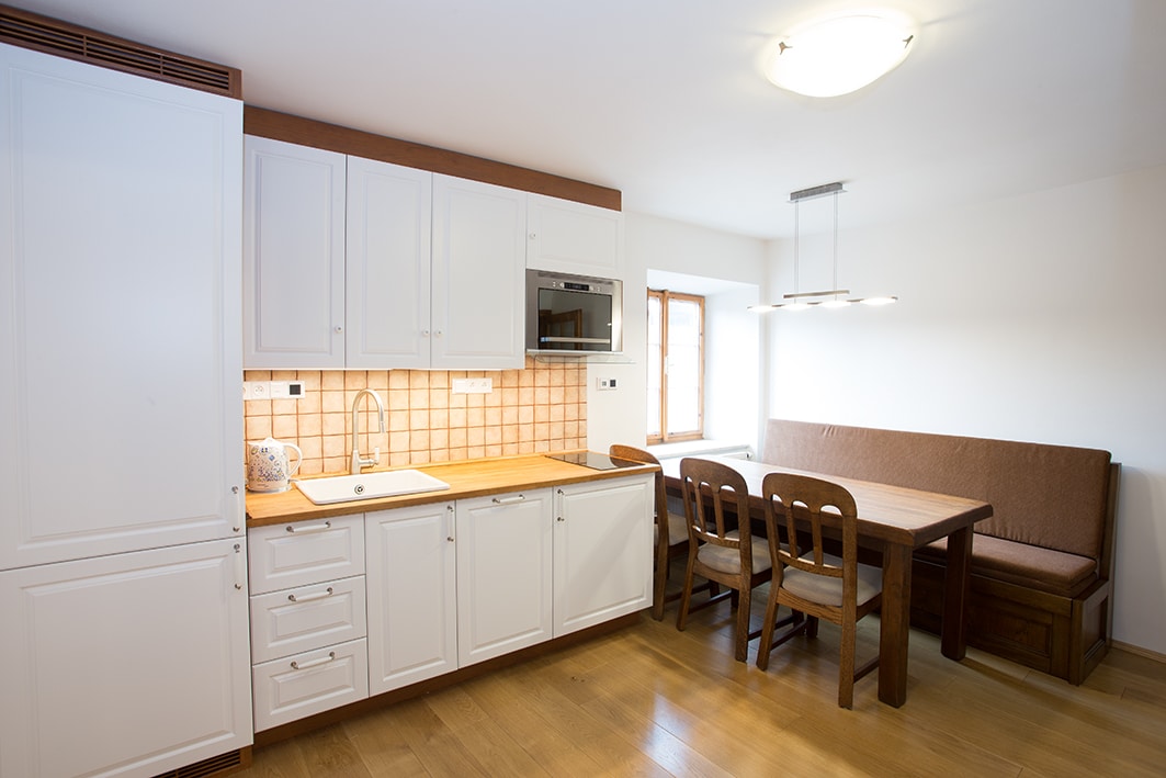 3 geniş vanna otağı olan gözəl 3 yataq otağı olan mənzil Kiçik Şəhərin mərkəzində, Çarlz körpüsünün düz yanında yerləşir. Küçə hətta Çarlz körpüsünün mövcudluğundan əvvəl də inşa edilib, çünki bəzi evlər 1326-cı ildən köhnə mətnlərdə qeyd olunub. 1705-ci ilə aid olan evimiz Tomáš Haffenecker tərəfindən inşa edilib və mənzildə yerli məktəb məktəbinə daxil olan tələbələr və ruhanilər yerləşir. Tavanın semiarda iştirak edən tələbələr tərəfindən rəngləndiyi güman edilir.