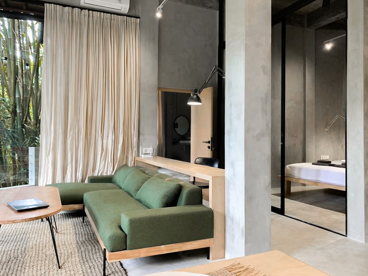 Gözəl dizaynlı Marrakech-meets-Bali 1 yataq mənzil. Küçənin üstündə, Ubudun səs-küyündə və buzzunda. Bu, cazibədarlıq və enerji yükləri olan ecazkar şəhər məskənidir, çarpayı ölçüsündə terrazzo vannası, xırtıldayan döşəkağılar, geniş paltar/baqaj saxlama+ 2 ventilyator+ 2 Kondisioner. Yolda Bar+kafesi ilə Ubud Sarayına 3 dəqiqəlik məsafədə +Bazar, alış-veriş, unikal kafelər/restoranlar hələ də Ubudun ürəyinin döyündüyünü hiss etmək və həyatın yuxarıdan getməsini seyr etmək üçün mükəmməl istirahət yeridir.