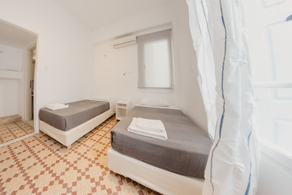 Mykonos mərkəzində damüstü ikinəfərlik otaq. Otaq şəhərə baxan dam terrasında və gözəl bağda yerləşir. Hamam otaqları digər qonaqlarla paylaşılır. Bir duş və bir tualet eyni mərtəbədə yerləşir. Digər 2 duş və tualet qonaqlar arasında paylaşılan birinci mərtəbədə yerləşir.