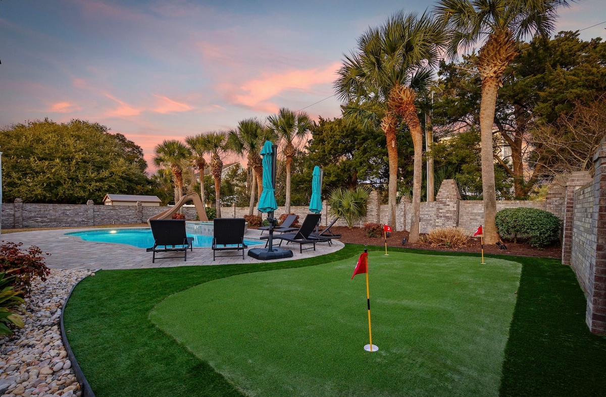 Çimərlikdən ~1 dəqiqəlik məsafədə (0,5 blok) yeni yenilənmiş ev! Murrell 's Inlet və Myrtle Beach State Park-dan 6 mil, Garden City-də The Pier-dən ~2 mil və Myrtle Beach Beynəlxalq Hava Limanından ~ 8 mil məsafədə. Sahəsi 2,100 kvadratmetrdən çoxdur və 12 nəfərə qədər adam yatır. Canlı televiziya kanalları, yüksək sürətli Wi-Fi, ayrıca hovuz (isidilməyən), pulsuz parkinq və açıq havada oturma yerləri olan 4 HDTV. Döşəkağılar (yəni yataq örtükləri, yastıqlar, komfortlar, dəsmallar) təmin edilir. Oktyabr - aprel aylarında ayrıca cakuzi mövcuddur.