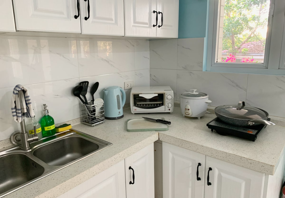 Come home to a spacious and modern, fully furnished studio apartment with your own fully equipped kitchen, balcony, and common garden. We are located in a quiet spot surrounded by greenery 4 km outside busy Coron town, close to the main road and public transport, only 12 minutes via tricycle to town center. We offer PLDT Fiber internet connection, perfect for digital nomads! And automatic power generator, a necessity in Coron where power failures are a regular occurrence.