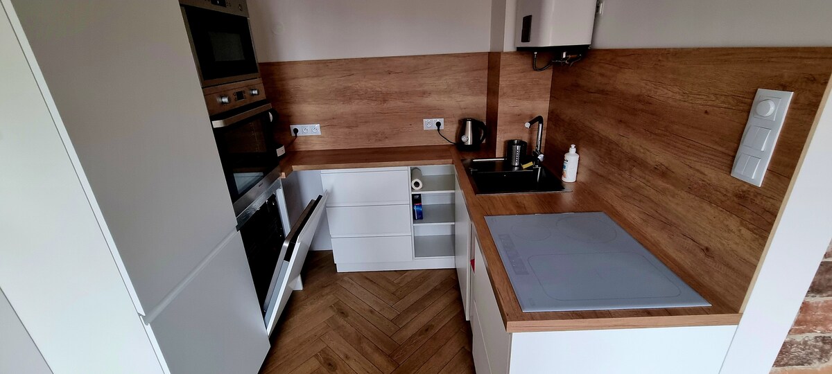 Yenilənmiş mənzilimiz müasir rahatlıq və dərhal səmimi və cəlbedici mühit yaradan, sevgi ilə hazırlanmış detalları birləşdirir. Əsas xüsusiyyət böyük divan və atmosfer işıqlandırması olan rahat ev kinoteatrıdır – axşamlar dincəlmək üçün mükəmməldir. İki sakit yataq otağı, tam təchiz olunmuş mətbəx və sürətli Wi-Fi və buxarı olan bağça məkanı cütlüklər, ailələr, dostlar və uzaqdan iş üçün ideal edir.
