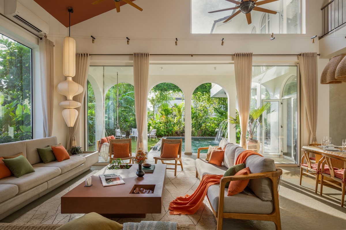 Tucked away in serene Bastora, North Goa, Casa Amore is a soulful 4-bedroom private pool villa just 25 minutes from Mopa Airport and under 10 minutes from Assagao. A timeless Indo-Portuguese home with graceful curves, arched windows, skylit bathrooms, and breezy balconies, it blends old-world charm with modern luxury. Lush greenery, a generous pool, and seamless indoor-outdoor living create a calm, elegant escape filled with light, warmth, and quiet beauty.