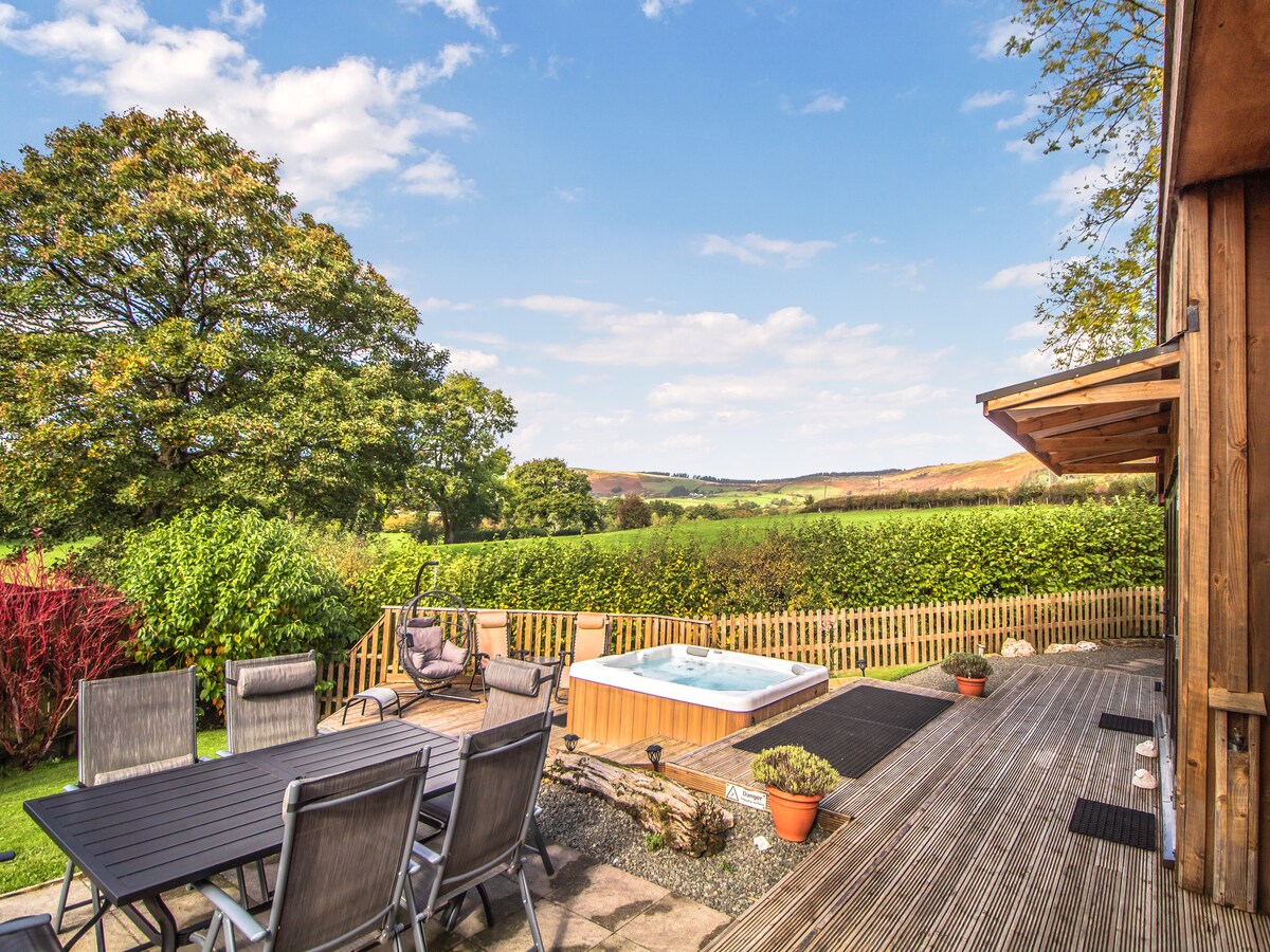 Cosy cabin nestled amongst hills & forestry, close to the Elan Valley. Surrounded by a working farm and beautiful Welsh countryside, with an abundance of walks from the cabin door. Private & tranquil, perfect for those wishing to escape the crowds and enjoy the great outdoors & local wildlife. A dark sky area. The cabin has a rustic luxury feel, with a wood fired hot tub, log burner, underfloor heating, boiling hot water tap, and a smart TV with sky sports, sky cinema, and Netflix