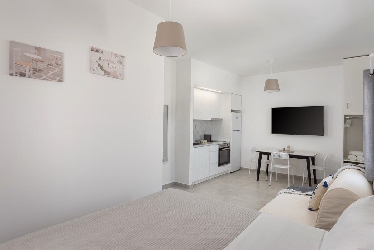 Open the sea-blue shutters and let in the cooling breeze, then whip up a snack at the urban concrete kitchen countertop at a breezy waterfront retreat. Step onto the spacious, leafy veranda for leisurely sunset drinks with unobstructed ocean views! The apartment is situated next to a sandy beach for a morning swim and a 2-minute walk from the center of Naousa and its main square. Shops, restaurants, bars, and clubs are within walking distance, yet the area is very quiet and calm!