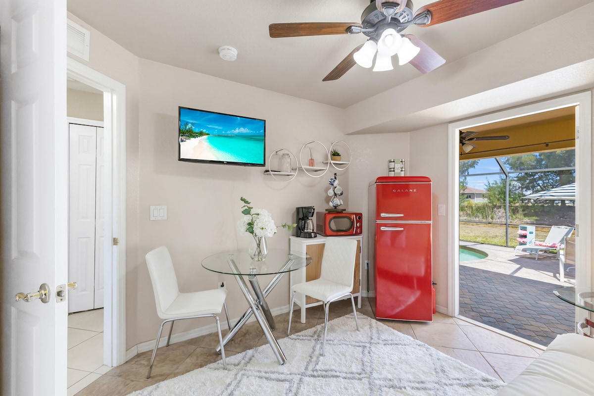 Fort-Mayers şəhərinin kənarında yerləşən, Kaloosahatchee çayına baxan Mango Cottage-dən uzaqda yerləşir. Günəşlər heyrətamizdir. Rahat verandaya Kinq ölçülü çarpayıdakı dəbdəbəli döşəkağılardan zövq alacaqsınız və bu, hissləri sevindirəcək. Siz 60" düz ekranlı Smart TV-dən zövq ala biləcəksiniz! . Kottec çöldə Keurig qəhvə maşını, toster, mikrodalğalı soba/konveksiya sobası və qril ilə tamamlanıb. Restoranlardan və gecə həyatından bir neçə dəqiqəlik məsafədəyik. Bu, siqaret ÇƏKMƏYƏN əmlakdır.
