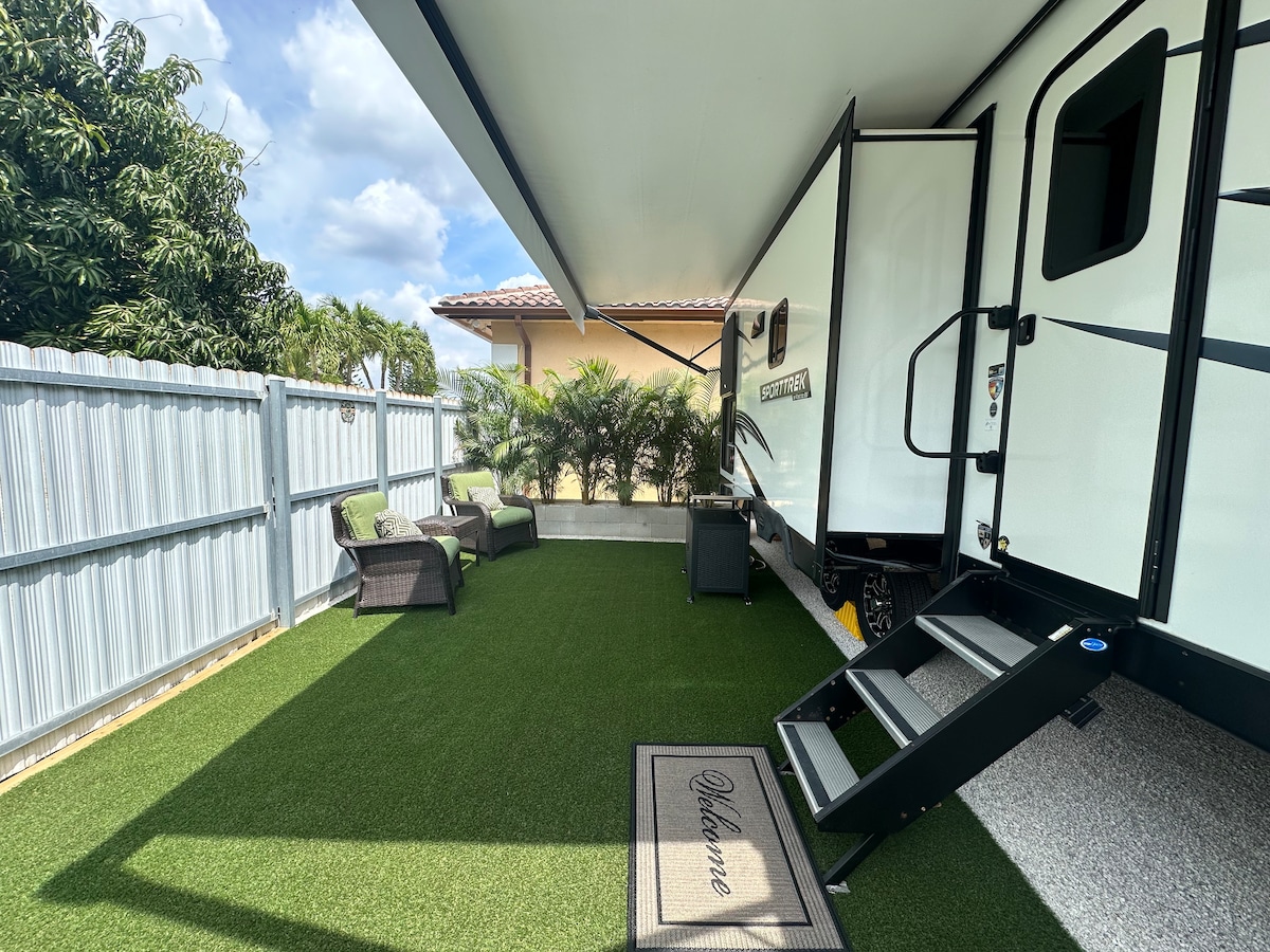 Redland tropik kənd təsərrüfatı ərazisində yerləşən Everqlades Milli Parkına, Biskayn Milli Parkına, Florida Keys-ə yaxındır. Bu, istirahət avtomobilləri, qayıqlar, qoşqular və s. üçün təhlükəsiz parkinqi olan qapalı əmlakdır. Studiya yüksək keyfiyyətli materiallarla tamamilə təmir edilib. Meyvə mövsüm vaxtı qonaqlar üçün əlçatandır və adətən, il ərzində mövsümdə nəsə olur. TESLA şarjı parkinq ərazisində mövcuddur (qonaq TESLA şarj kabelini gətirməlidir). 12 yaşdan kiçik uşaq yoxdur.
