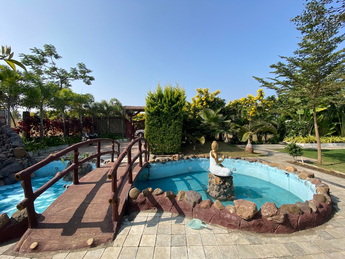 🍀Escape to Nature’s Edge Resort – Jyoti Farm, a peaceful 3BR farmhouse surrounded by greenery. Enjoy slow living with home-delivered meals, open sit-outs, and full security (guard & CCTV). 🛕 Perfect base to explore Omkareshwar Jyotirlinga (1 hr), Mahakaleshwar Ujjain (1.5 hrs), Maheshwar (1 hr) and Mandu Forts (1 hr). ✈️ Our place is about a 45 mislns drive from Indore Airport. We can arrange for cabs if required. Relax, recharge, and feel at home in nature. 🌿