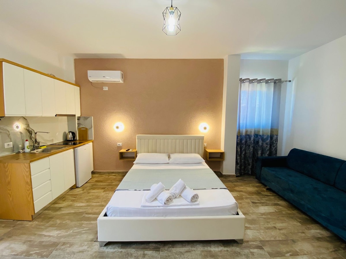Lungomare-də "Uji I Ftohte" tərəfindən yerləşən gözəl təpəlik studiyamıza xoş gəlmisiniz. Tam təchiz olunmuş mətbəxdən, rahat yataq sahəsindən, müasir hamam otağından və valehedici dəniz mənzərələri təklif edən geniş balkondan zövq alın. Bütün çimərliklər, kafelər, marketlər və restoranlar gəzintiyə çıxdıqdan sonra 5-15 dəqiqə ərzindədir. Cəmi 4 dəqiqə uzaqlıqda yerləşən avtobus dayanacağı Vloranın canlı şəhər mərkəzinə cəmi 35 qəpiyə asan giriş imkanı təklif edir. Öz-özünə giriş və çıxış qonaqlamanızı daha da rahatlaşdırır.