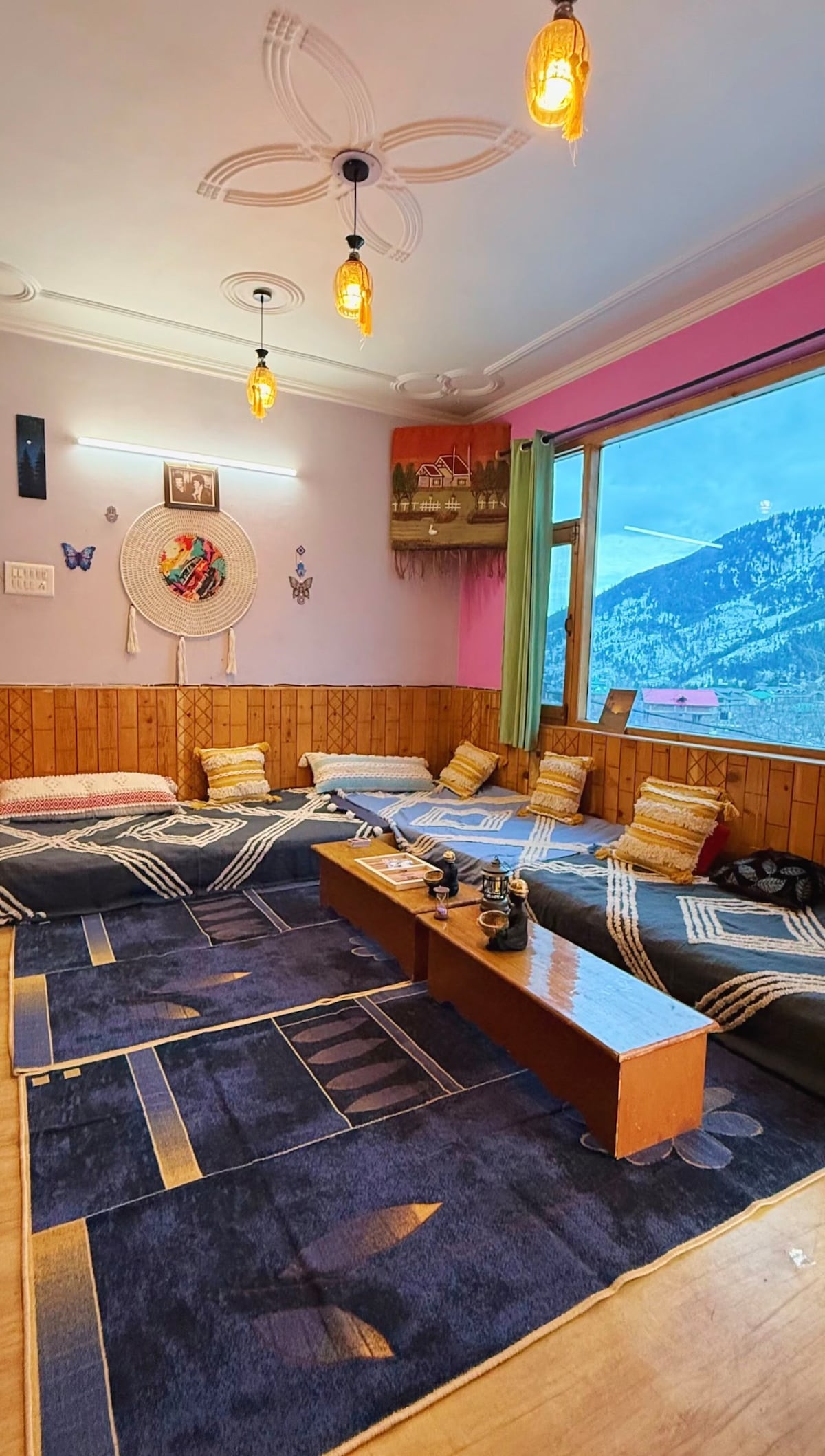 farm-stay is perfect for travelers seeking quiet, beauty, and authentic mountain living. Set in a picturesque location, the studio offers spectacular valley and mountain views, with the soothing sound of birds and the gentle roar of the Beas River creating a truly calming atmosphere. The fully equipped studio is designed for comfort and simplicity. It features a cozy double bed, wooden flooring, a study table, a clean modern bathroom, and a complete kitchen for self-cooking.