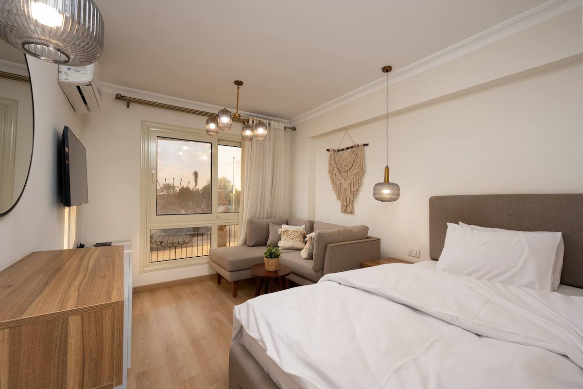 Qahirə hava limanından və Heliopolisdən 15 dəqiqəlik məsafədə yerləşən Golden Gates Compound-5 dəqiqəlik məsafədə, Yeni Qahirəyə və Nasr Şəhərinə 10 dəqiqəlik məsafədə yerləşən 1 yataq otaqlı incimizi kəşf edin. Tam təchiz olunmuş Amerika mətbəxi, müasir və boho ab-havasının dəbli qarışığı. Bağ mənzərəsindən, 24/7 təhlükəsizlikdən və qəhvə mağazaları, restoranlar, Carrefour Hiper Bazarı və hətta xəstəxana kimi ərazidəki imkanlardan zövq alın. Yayım xidmətləri ilə tamamlanmış 65 düymlük ağıllı televizorla dincəlin və sürətli Wi-Fi ilə əlaqəli qalın. Qahirə sərgüzəştiniz buradan başlayır.
