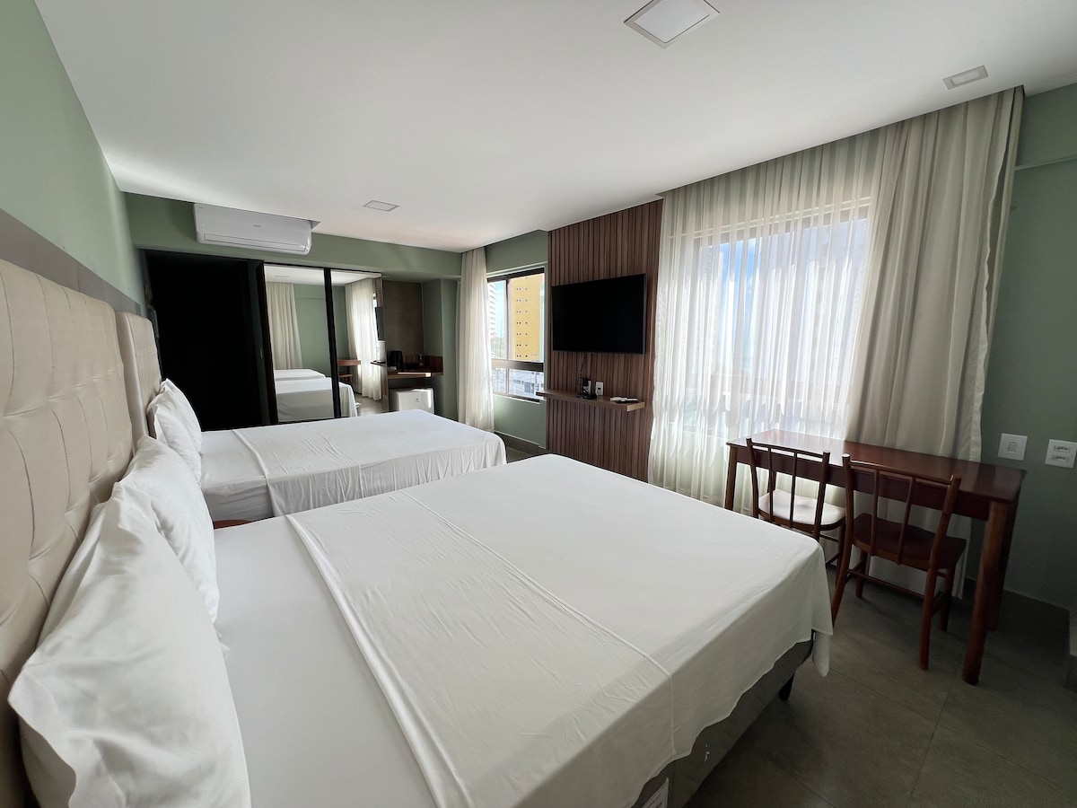 Natalda ən yaxşı yerdə. Av. Engenheiro Roberto freire, yüksək mərtəbə və dəniz mənzərəli yerdə yerləşir. Milad turizminin mərkəzində. Çimərliyə, ticarət mərkəzlərinə, apteklərə və supermarketlərə yaxındır. Binada parkinq, üzgüçülük hovuzu, restoran, fitnes mərkəzi və tədbirlər üçün auditoriya var. Otaq ikinəfərlik çarpayı, soyuducu və mikrodalğalı soba, kondisioner, televizor və isti duş ilə yüksək mərtəbədədir.