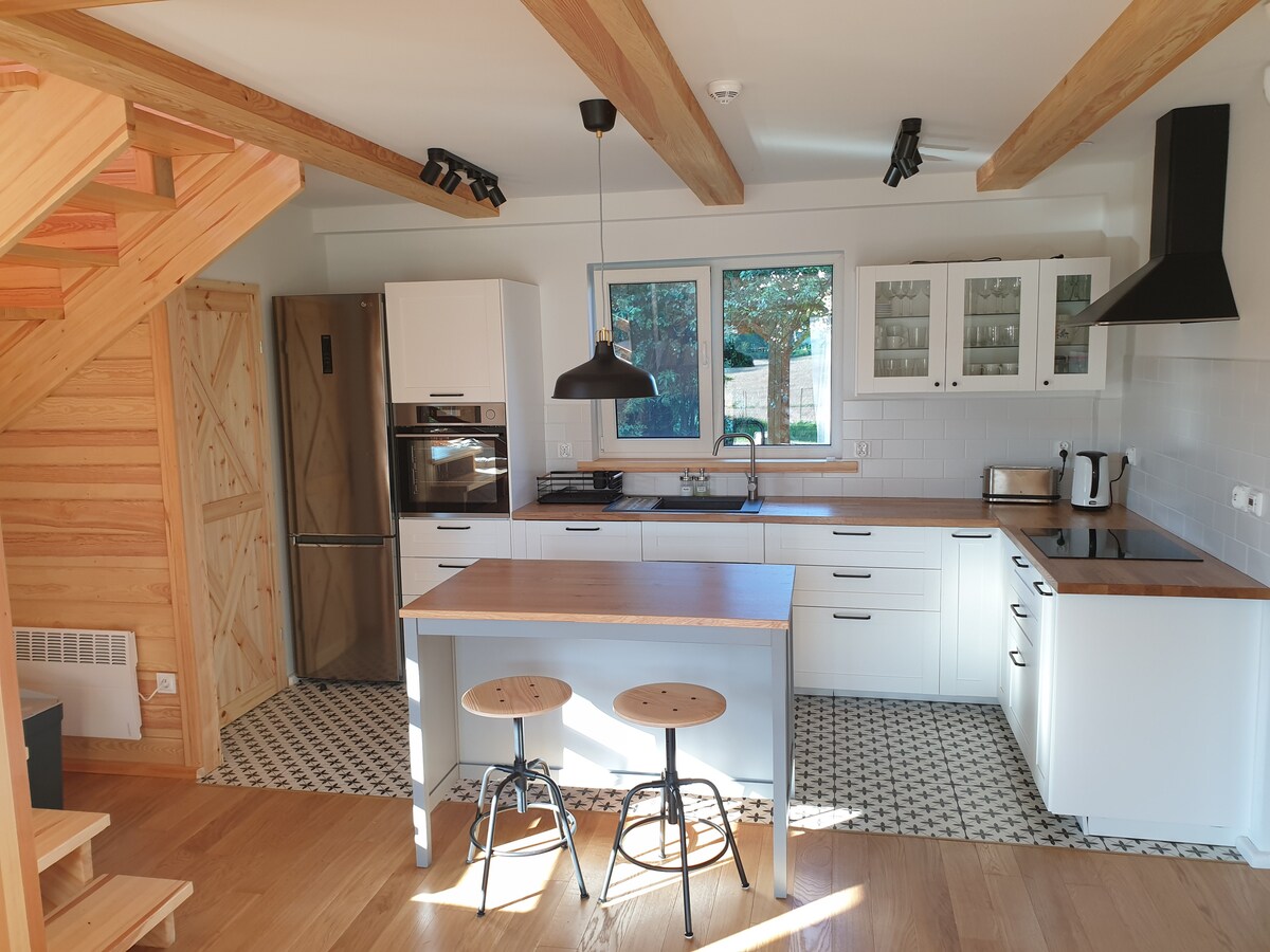 Cosy wooden house with private beach, jetty, rowing boat and fantastic view of the lake and surrounding trees. Finished to a high standard, 2 bathrooms, 4 bedrooms, living room with fireplace, fully equipped kitchen and large terrace, all designed having comfort and satisfaction of our guests in mind. On the fenced plot around the house, apart from a bonfire place with handmade benches and comfortable hammocks, you can find a lot of green space enabling all kinds of family recreation and relax.