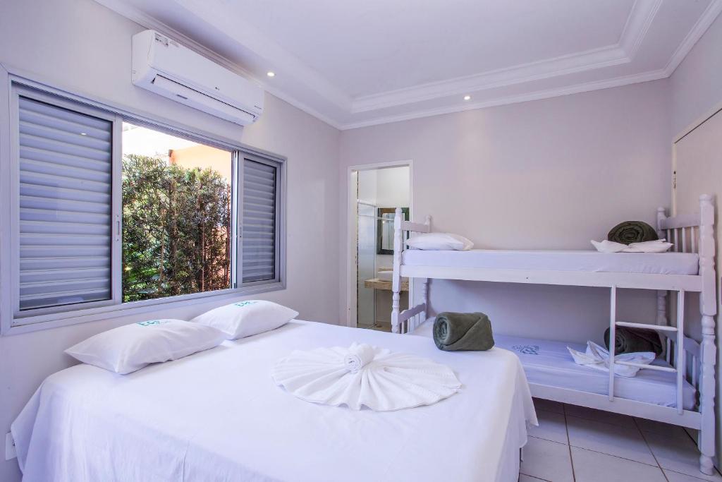 O quarto conta com 1 cama Queen, que pode ser convertida em duas de solteiro, e 1 beliche, acomodando até 4 pessoas. Está equipado com ar-condicionado, frigobar, TV de tela plana e banheiro privativo.