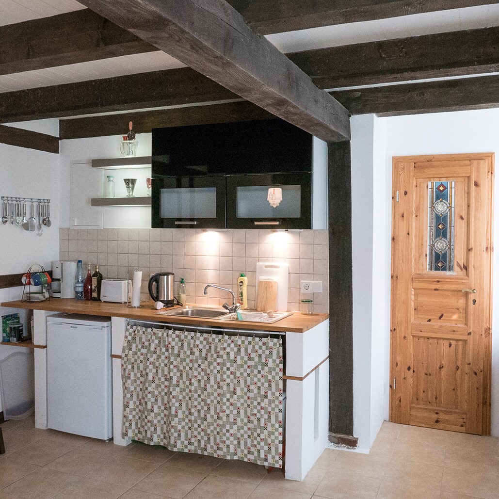 Die Ferienwohnung ist in einer 120 Jahre alten Backstein-Remise. Sie hat freien Blick nach Süden ins Havelland. Im Erdgeschoss ist eine Wohnküche mit Schlafsofa, Terrasse und eigenem Garten. Im ersten Stock das Schlafzimmer, ein Balkon mit Panoramablick und das Badezimmer mit einladender Dusche. Fläche (ohne Aussenanlagen): 40qm. Bettwäsche und Handtücher sind im Preis inbegriffen. Das anliegende Loft (45 qm) kann dazu gemietet werden. Dort können 3 weitere Personen unterkommen.