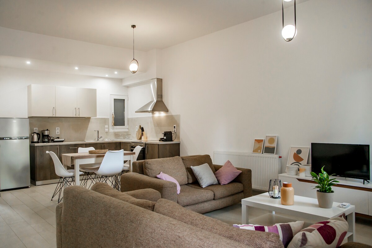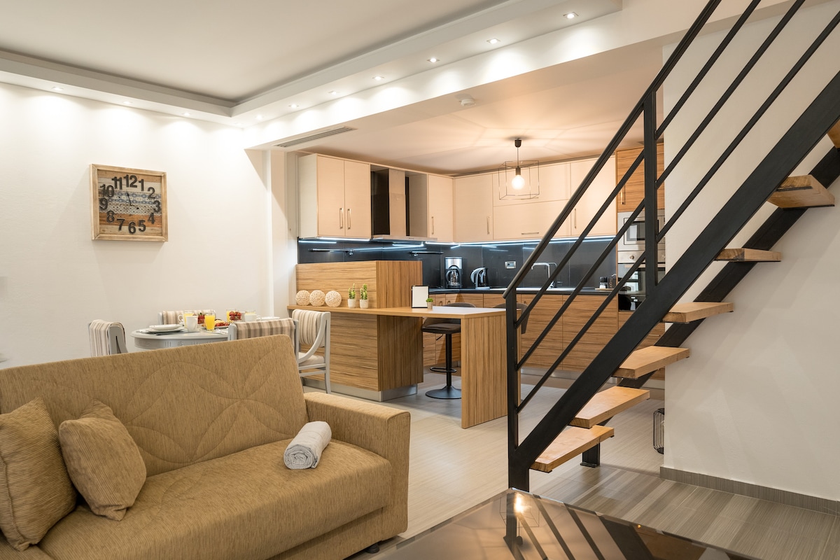 90 kv.m-lik qəşəng və minimal loft, 2019-cu ilin may ayında təmir edilmiş, Heraklion limanı və qəsrin üzərində yerləşən, möhtəşəm dənizə və bağ mənzərəsinə baxan 2 xüsusi eyvanı olan qəşəng və minimal loft! İki böyük yataq otağı dərin yuxu üçün eko aloe vera döşəkləri olan King ölçülü çarpayılar təklif edir! 58inches tv.kchen-də Netflix-i seyr edən böyük divanda özünüzü əzizləyin və müasir induksiya və soba ilə tam təchiz olunub!Rahatlığınız üçün paltaryuyan və qurutma maşını! Hamam otağı mütləq minimalistik və genişdir.Eko-İnverter Klima və pulsuz parkinq!