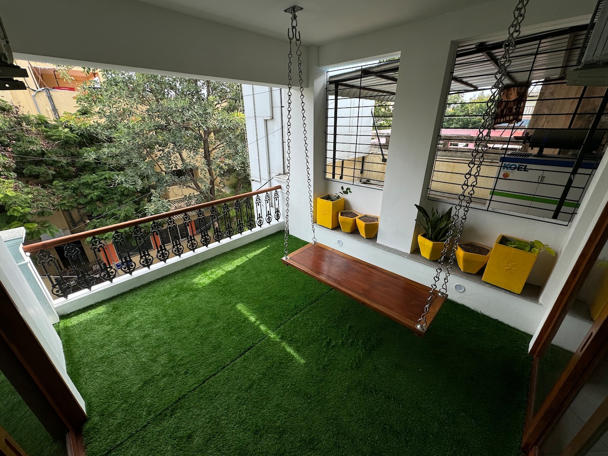 Aurovildəki evdən uzaqdakı eviniz Çetinad mövzusuna uyğun zövqlə bəzədilib. Evimizin hər bir guşəsi rəngarəng interyer, kolam sənəti, antik dekorasiya və daha çoxu ilə Instagram-a layiqdir. 1BHK qonaq otağında yelləncək çarpayısı və divan çarpayısı ilə 4 nəfərə qədər insanı rahatlıqla yerləşdirə bilər. Yaxınlıqda çoxlu restoranlar var, mətbəximiz bütün ehtiyaclarınız üçün düşünülmüş şəkildə təchiz edilib - sürətli omlet və ya tam hind yeməyi hazırlamaqdır. Odur ki, əyləşin, dincəlin və qəhvənizi qurtum-qurtum iç
