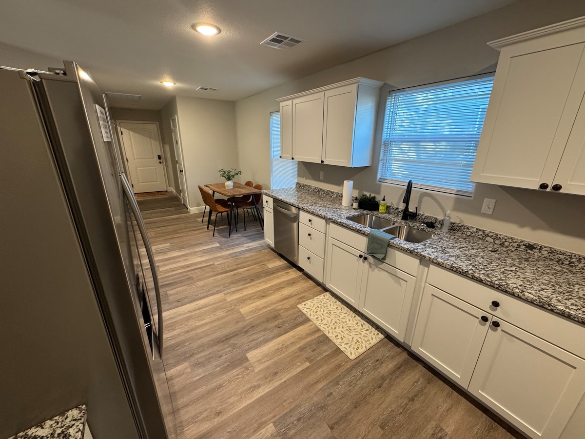 Geniş studiya tərtibatında RAHAT kraliça çarpayısı! Rahat divan 2-ci kraliça çarpayısına açılır. Arxa həyətə girişi olan bu XÜSUSİ gəzinti zirzəmisi möhtəşəm köhnə palıd ağacları ilə kölgələnib. Bu otaqlı açıq döşəmə planında təbii işıq üçün pəncərələr çoxdur. Tam təchiz olunmuş tam ölçülü mətbəx. Böyük duş. Kiçik Paltaryuyan/qurudan maşın. Yüksək sürətli internet. Tesla şarj cihazı. Yaşayış məhəlləsi. Parklar, tennis, YMCA & Crowder Kollecinə yaxındır. GİRİŞ ÜÇÜN DİK YAMAC.