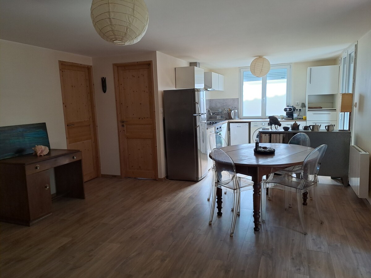 Sizi Lionun mərkəzindən 25 dəqiqəlik məsafədə və Beaujolais qapılarında yerləşən evimizə bitişik bu rahat, müstəqil mənzildə qarşılamaqdan məmnun olarıq. Yeni və çox yaxşı təchiz olunmuş mənzilin bütün komfortlarından, eyni zamanda Monts d 'Or mənzərəli evimizin böyük bağından və qızdırılan üzgüçülük hovuzunun günəşli günlərindən zövq alacaqsınız. Qonaq otağına açıq mətbəx, yataq otağı və iki nəfərlik çarpayısı olan mezzanin mənzili təşkil edir Qapalı əmlakda parkinq