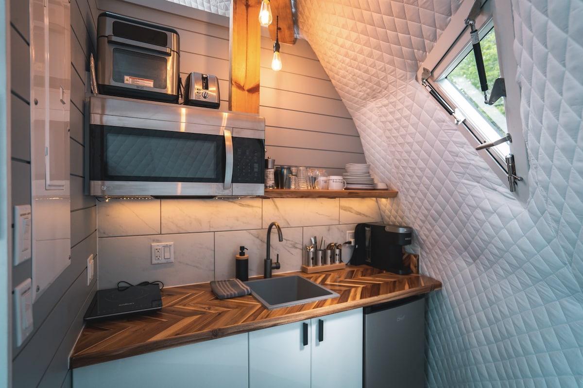 "The Bay Dome" Fully equipped kitchen which includes a fridge, induction cooker, kettle, toaster oven, microwave, dishes, utensils, glasses, cook wear, as well as complimentary tea and coffee. Private bathroom with a toilet, shower, and all toiletries. Queen size bed with luxurious, sustainable bedding, and the option of a pull out futon for children. The outdoor area includes a BBQ, private wood fired hot tub, and patio furniture. Kayaks are available during the summer months, as well as a communal fire pit. **Please note, the domes are located down a hill from the parking area. Only book if you and your party is physically fit enough to get down and up the hill**