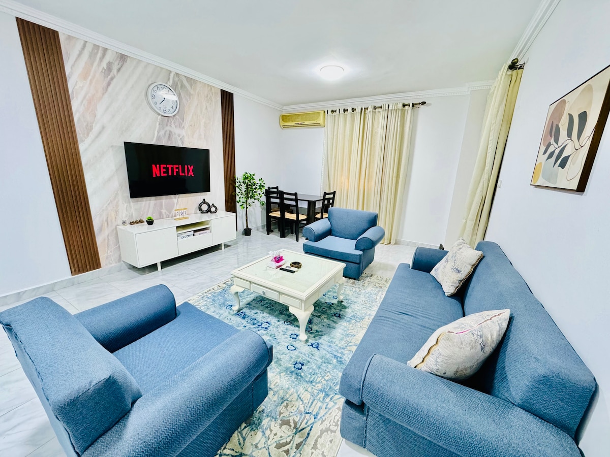Welcome to my lovely apartment! With 2 bedrooms and a fancy reception area, it's perfect for families or groups of friends traveling together. Very good garden view to feel Relaxing after your day. The apartment is equipped with air conditioning to keep you cool and comfortable during hot summer days. You'll love the stylish decor and cozy atmosphere, which make it the perfect home away from home. 5 mins away from River walk Mall & The Water way Mall. ** 20 mins from Airport **