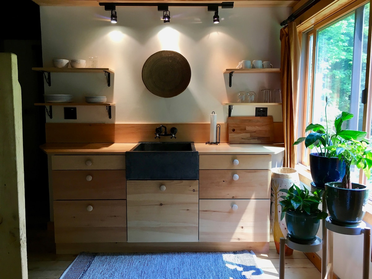 Private entrance & space. French doors large windows bright and airy. Lg living rm. Bed Rm w/queen. bed rm W/ king (two twins made up as king)all the time. Small kitchen w/micro coffee maker & fridge. NO STOVE only a single NuWave burner. Come & go as you please. This apartment is the lower level of our entire home. Very private and separate space. Enjoy 25 Acres of wooded land. Only 2 miles to town. Age 21 or older to book. We do not take children under 12 No parties NoPets No smoking.
