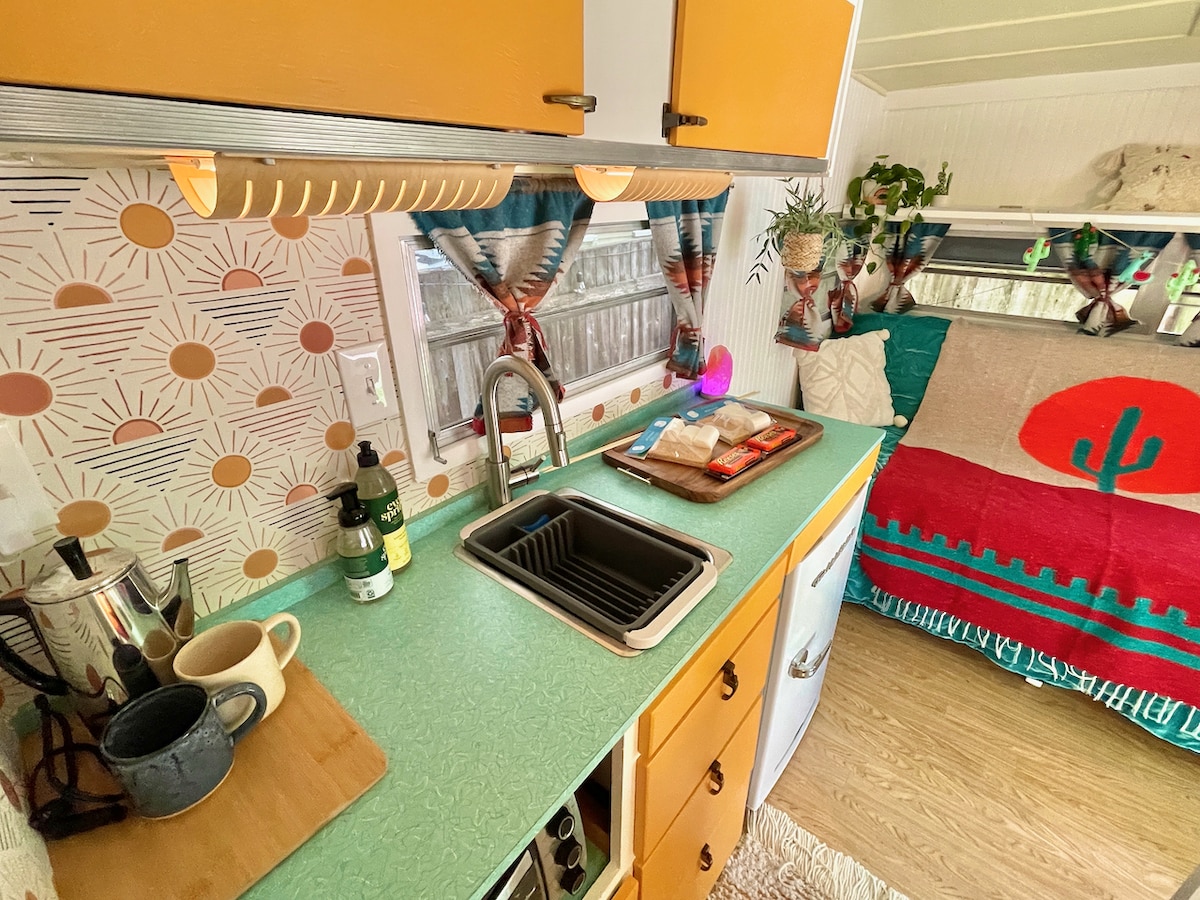 Updated Camper. Enjoy games, movies, kayaks/canoe (included) & swimming during the day & nature walks on 1 of the trails nearby & cook on the grill. 1 car please, park in driveway. In a neighborhood. 2 people-please no other guests. Stovetop, microwave, toaster, coffee maker & grill. Heat/AC. Flushing toilet. We do ask you to limit water use, we provide paper & plastic dinnerware. Many activities nearby oven/firepit No animals (Health concern for cleaner) No smoking. Children 7 & older.