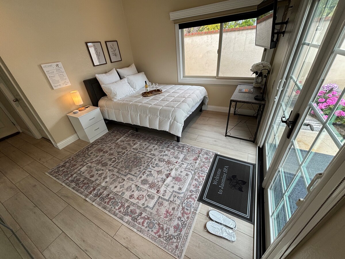 Slip into a quiet, private stay that feels tucked away yet close to everything. This cozy space is designed for rest, simplicity, and easy evenings after a full day out. - Queen bed with Nectar mattress - Wifi and 75” Smart 4K TV - Full Bathroom, Kitchenette and Dining - Central heating & cooling (shared system) - EV charger (220V) available on request - Located near the 405 and 55 freeways - 20 minutes to Disneyland - 10 minutes to the beach and shops Feels easy to arrive—and easy to stay!