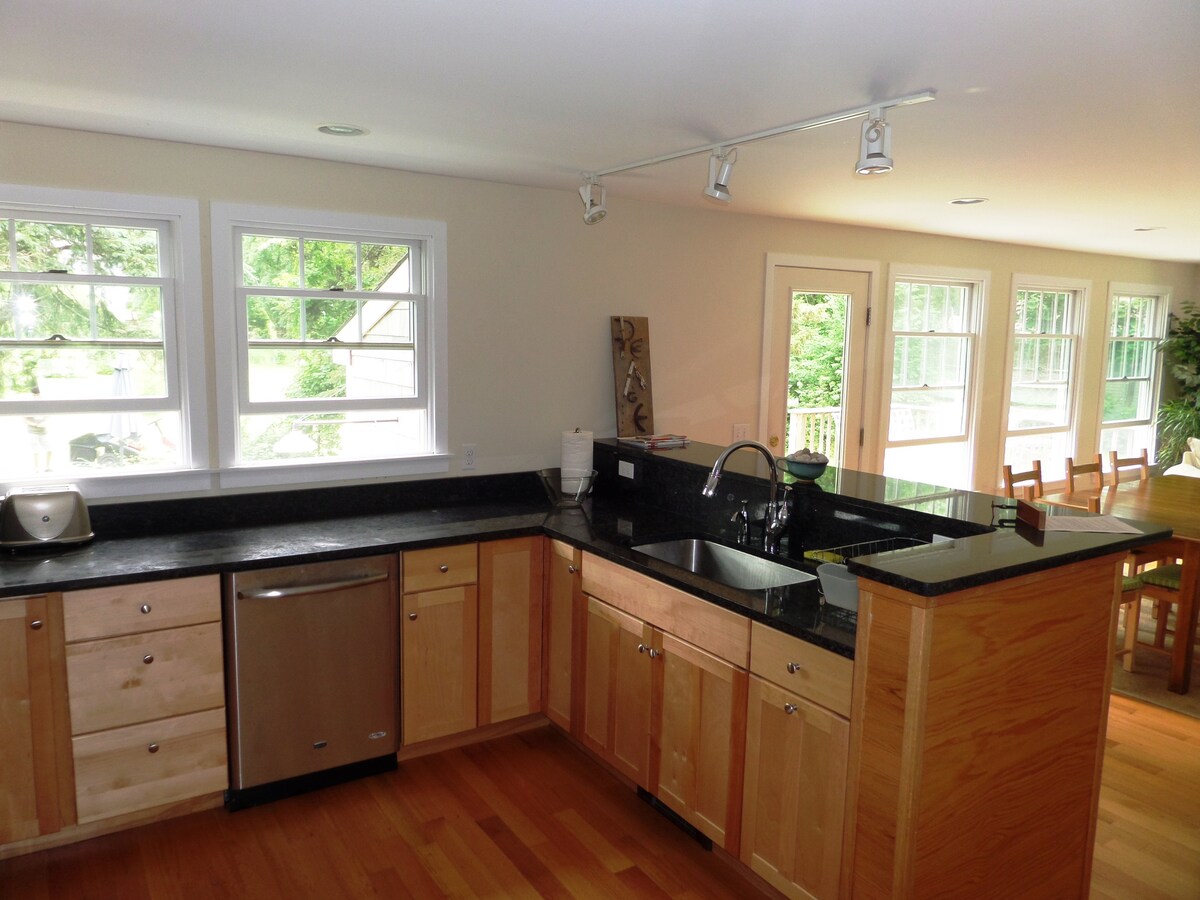 Beautiful 4 bedroom with an additional queen size pullout. Can sleep 8 and accommodates more sleeping areas for children under 12. Welcome to Gather Farm House! We are located on a 6 acre tree farm where we grow unique tree varieties and fruit. Our farm is across from New Englands top Public Golf Course, Newport National Golf Course and is a short distance to the beach and downtown Newport. Our great room boasts a bright open airy layout perfect for your family gathering