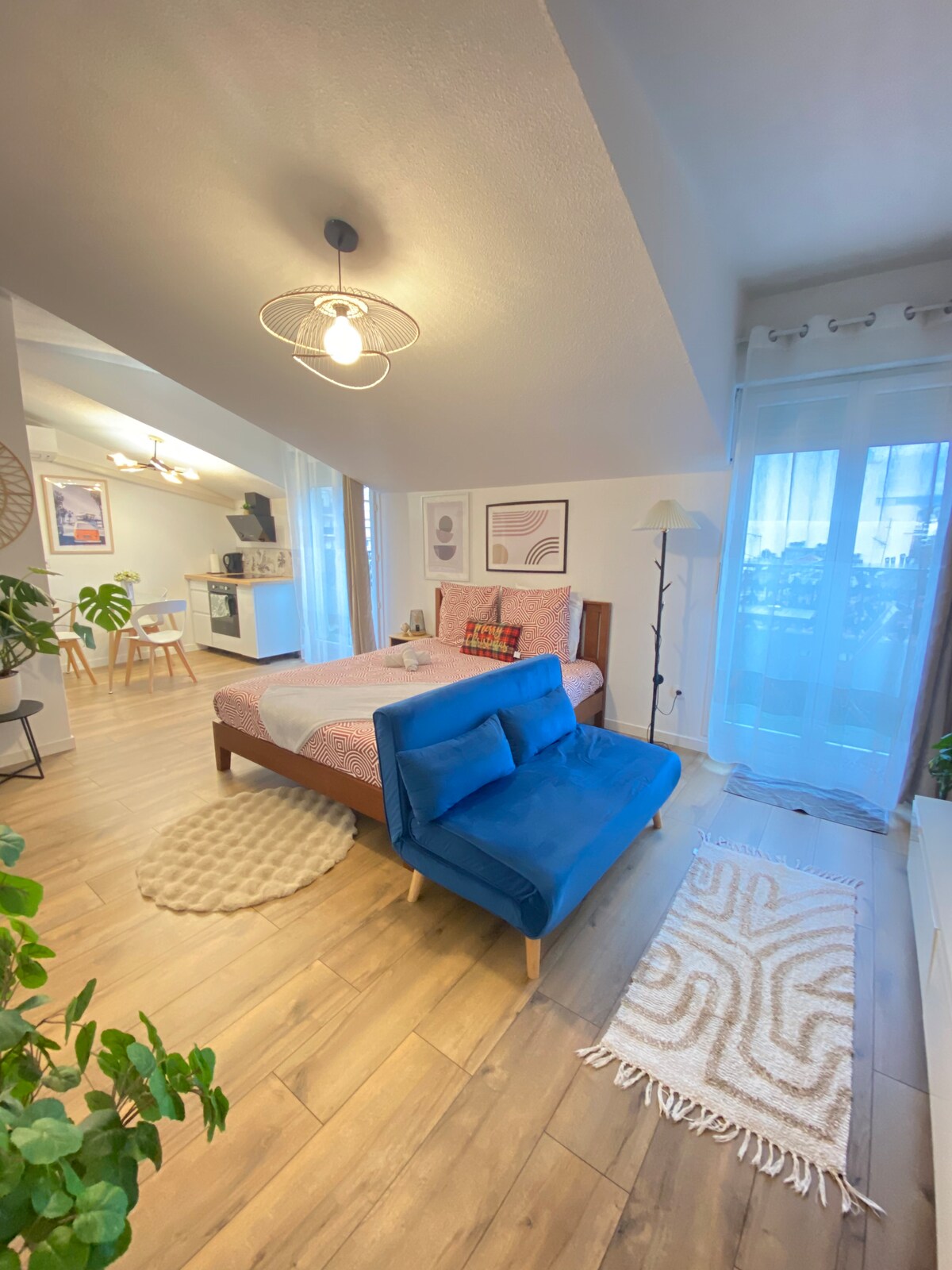 Studio de 27 m2 dans le "Carré d'or"(garage sur réservation, possible), avec tous ses petits commerces et restaurants. Logement idéal pour un séjour à la mer (300 m des plages). Le tramway se trouve à 450 m (6 minutes à pied), la gare des trains est à 900m(11mn). Le studio est climatisé et composé d'une terrasse de 10 m2, d'un lit double en 140 cm, d'un canapé lit "BZ" en 140 cm, d'une cuisine équipée (ustensiles, Airfryer, cocotte minute, différentes cafetières, dont une "Nespresso").
