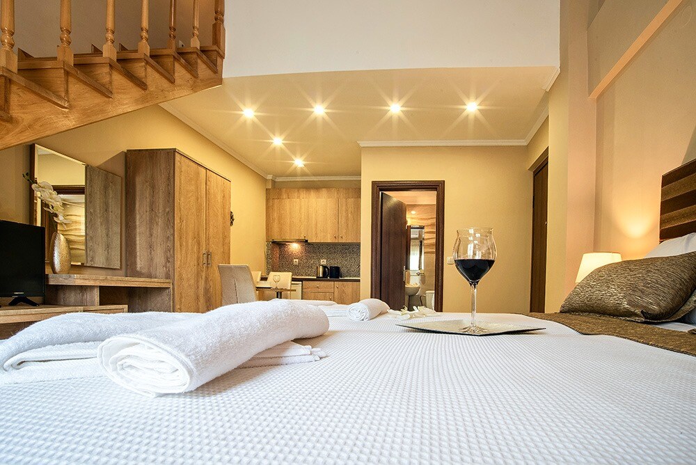 Bu dəbli məkan Skala Fourkasın mərkəzində, dənizə çox yaxın ərazidə yerləşir. İkinəfərlik Studiyalarımız böyük ikinəfərlik çarpayısı, geniş hamam otağı, kiçik mətbəxi və yemək masası olan bir geniş yataq otağından ibarətdir.