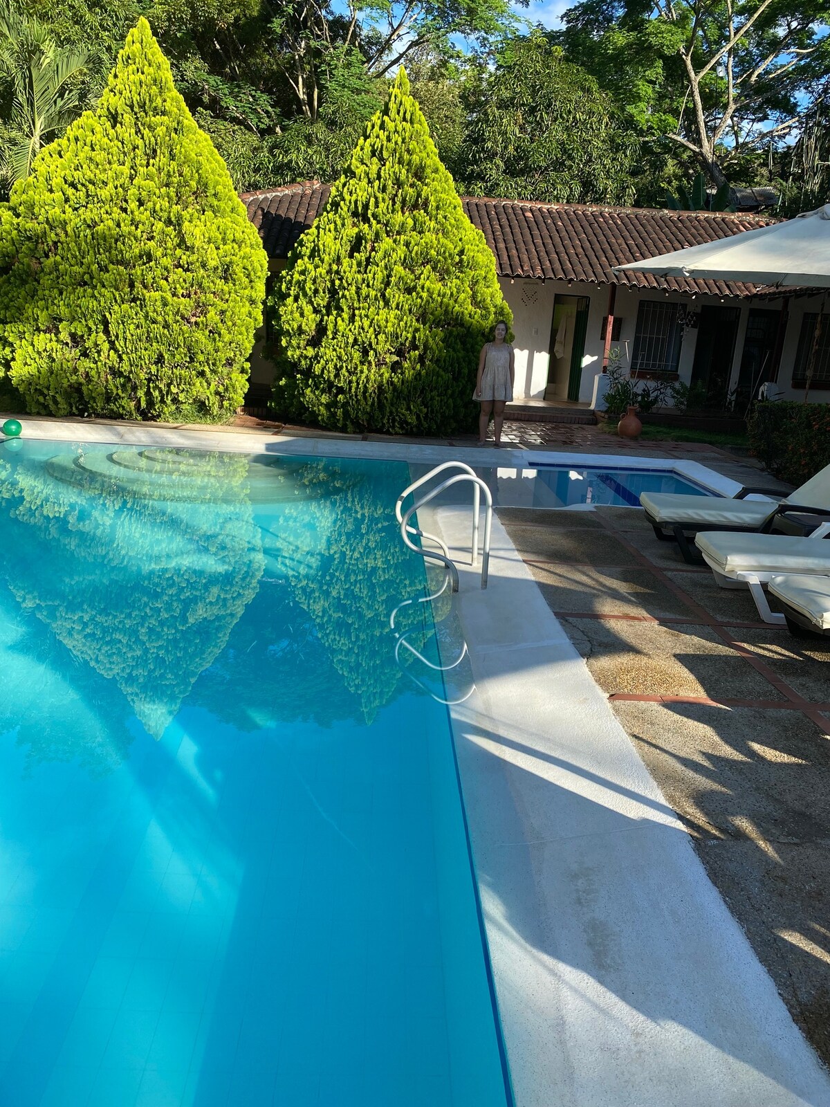 Completely private property (not shared with other guests), secure, spacious, with green areas, swimming pool and brand new bathrooms. The administrators live on the property, have their own house, are in charge of maintaining the pool and gardens and do not share any services with the guests. It is located near Melgar, a 15-minute walk from Cafam - Éxito - Nightclub Zone. The house is cool, comfortable, spacious and has beautiful trees.