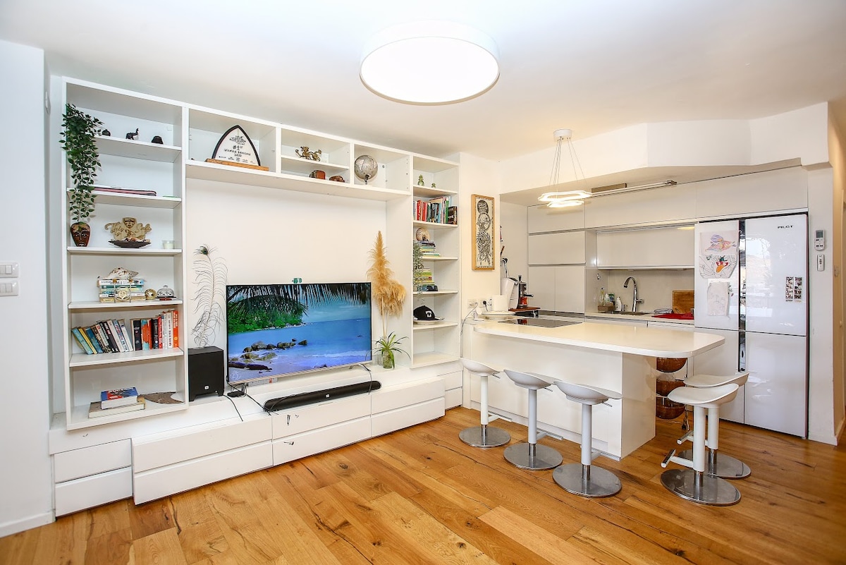 amazing vacation apartment located in front of the sea Gordon Beach. The building is located among the best hotels in Tel Aviv. The popular beach full of surfers, colorful boats, and people playing on the beach. All this is perfectly synchronized with the sea view The apartment is 85 meters in size, divided in a very spacious way. With 2 bedrooms, living room and kitchen. Fast fiber optic internet in the entire apartment. The apartment is on the 3rd floor without an elevator.