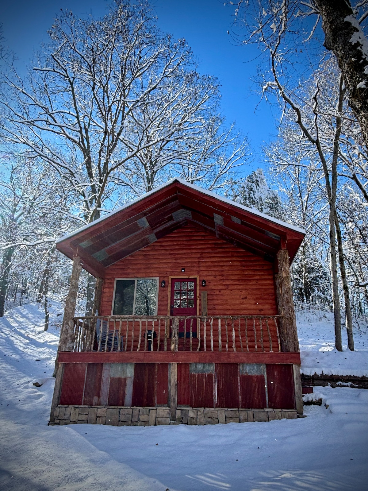 Welcome to The Ridge Ranch LLC, a 10 acre Glampground adjacent to the 2,106 acre Huckleberry Ridge Conservation Area, located 3 miles from where Little Sugar & Big Sugar Creek form Elk River. We have two rustic tiny cabins available for short term rental plus access to our 6 person luxury hot tub & use of the outdoor shower (in season), fire pit and stage! In February 2026 this cabin is the only cabin rented short term and only guests of this cabin have access to the hot tub, all to yourself!