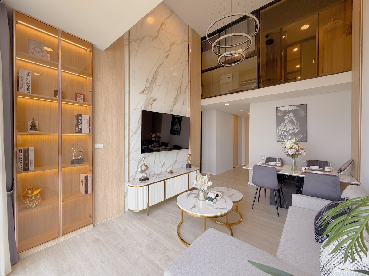 Banqkokun panoramik mənzərəsi olan 2 yataq otaqlı ikimərtəbəli mənzil. Yerdən tavana qədər uzanan pəncərələr məkanı təbii işıqla doldurur, müasir Yapandi interyeri isə cütlüklər, ailələr və ya işgüzar səyahətçilər üçün ideal olan sakit və zərif atmosfer yaradır. Tam təchiz olunmuş mətbəx, 65 düymlük smart TV və ayrıca eyvanı olan geniş yaşayış sahəsi. Eyni mərtəbədə idman zalı və sağlamlıq spa mərkəzinə, üstəlik damda hovuz və günəşlənmə terrasına birbaşa giriş. Binanın içərisində qida mərkəzi, kafelər və 24/7 market yerləşir,