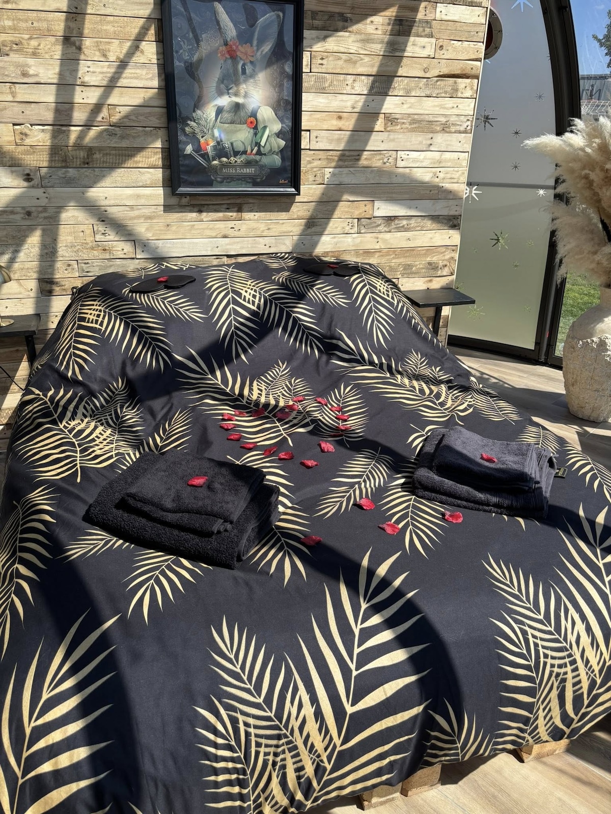 Dôme avec suite pour le petit déjeuner en pleine nature . Coin extérieur aussi pour se reposer . Accès au jacuzzi avec véranda bio climatique et sauna privatif . Arrivée de 17h et départ vers midi . Le Dôme est chauffé en hiver et climatisé en été . Micro onde , machine à café et thé , frigo , nécessaire de toilette gel douche et crème de soin , serviettes , peignoirs et sandalettes .. Couchage de 2 a 5 personnes En option massages , soin visage , manucure et pédicure , épilation .