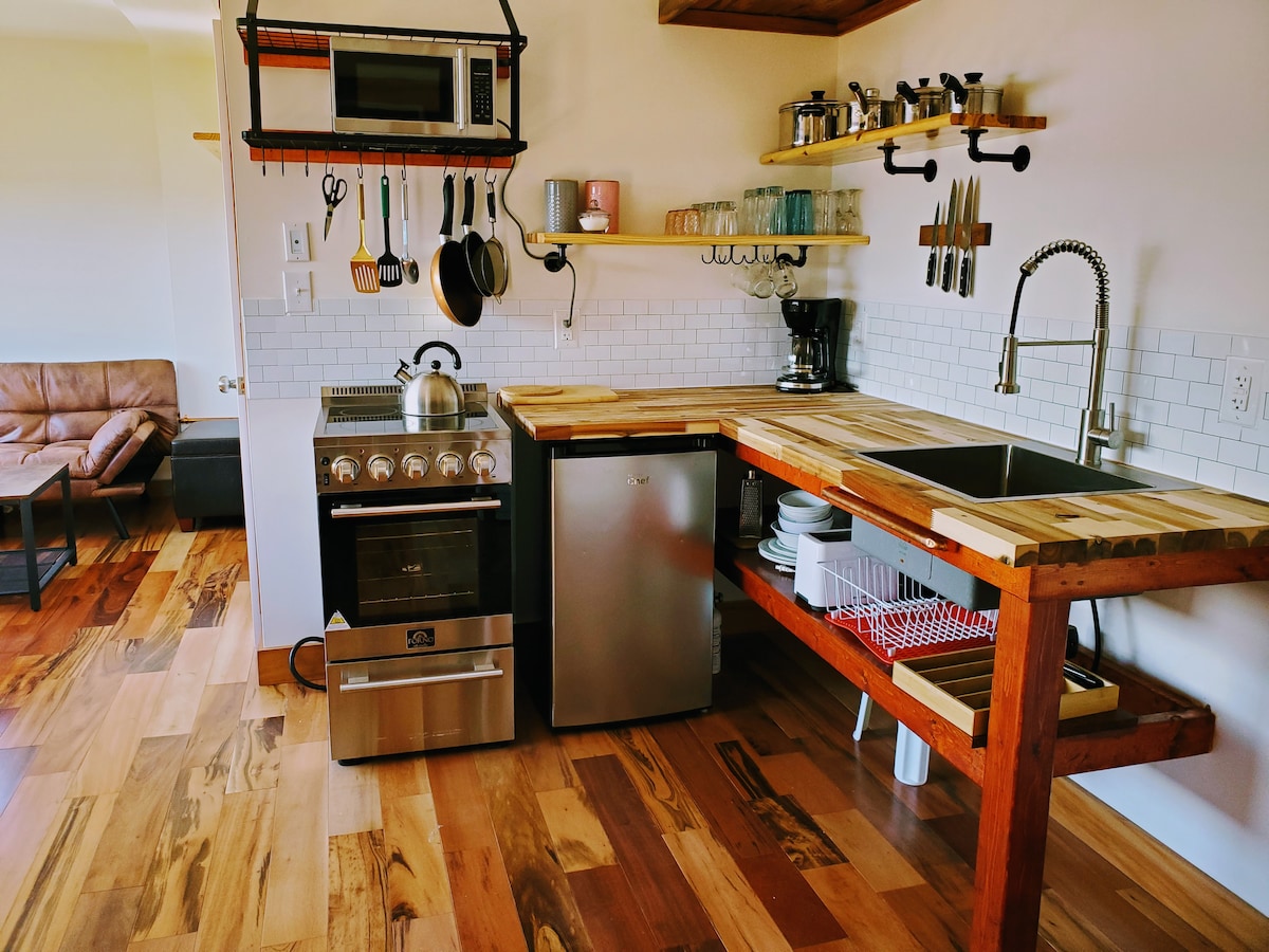 Modern farmhouse tiny home on the Delaware River with stunning views spanning 1 mile in either direction of the mighty Delaware and bald eagles. This 4 season tiny home features AC and heat with a dinette in the kitchen for 4 that can be turned into a bed for two children or one adult. Refrigerator, oven, and microwave round out this kitchen. The bathroom includes a flush toilet, sink, and shower. The bedroom has a queen size memory foam mattress and big windows to hear the rushing water.
