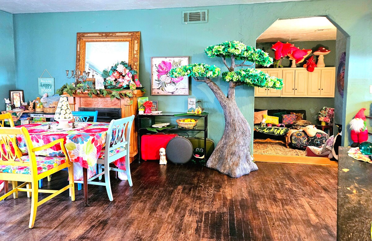 The Happy House is not just a place to sleep, its a colorful, magical, whismsical and Happy experience! Happy decor, art, flowers, mushrooms, and mythical creatures brighten every smile. Enjoy the outdoors with the privacy fenced XL backyard, trampoline, swing set, grill, and patio table or enjoy the snacks, drinks, toys, board games, and TV den inside. Bring your pets big or small, we'll be happy to welcome them all! Just 5 min to Tinker AFB, 15 min to Paycom, Bricktown, OKC Zoo.