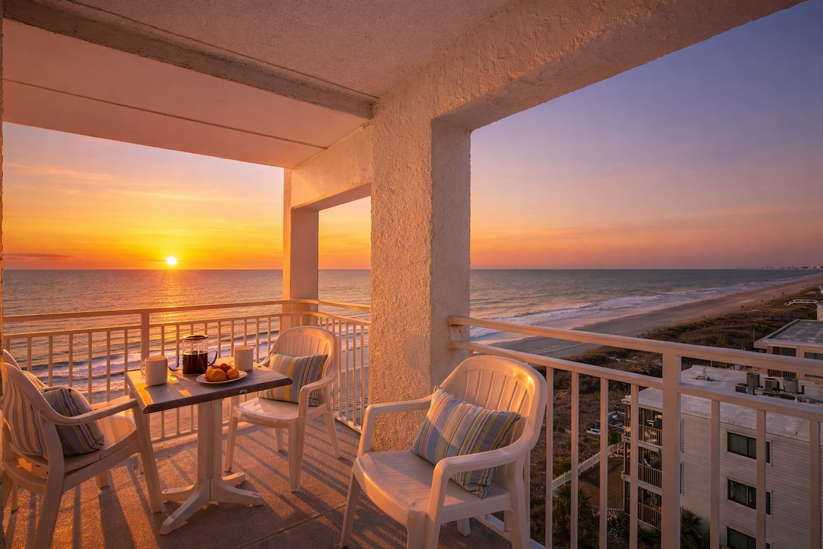 I am a proud to be a **SUPERHOST!** - Airbnb's TOP HOST Rating! This is a penthouse (11th floor) oceanfront end corner-unit located in The Oceans condo building with amazing panoramic views! There are 2 elevators in the building and an oceanfront pool with the most amazing view on the 4th floor. Location is stellar: close to grocery, restaurants, bars, mini golf, etc. Beach is wide and gorgeous here! This condo can sleep up to 9 people (8 adults and 1 baby). Fresh towels & linens included.