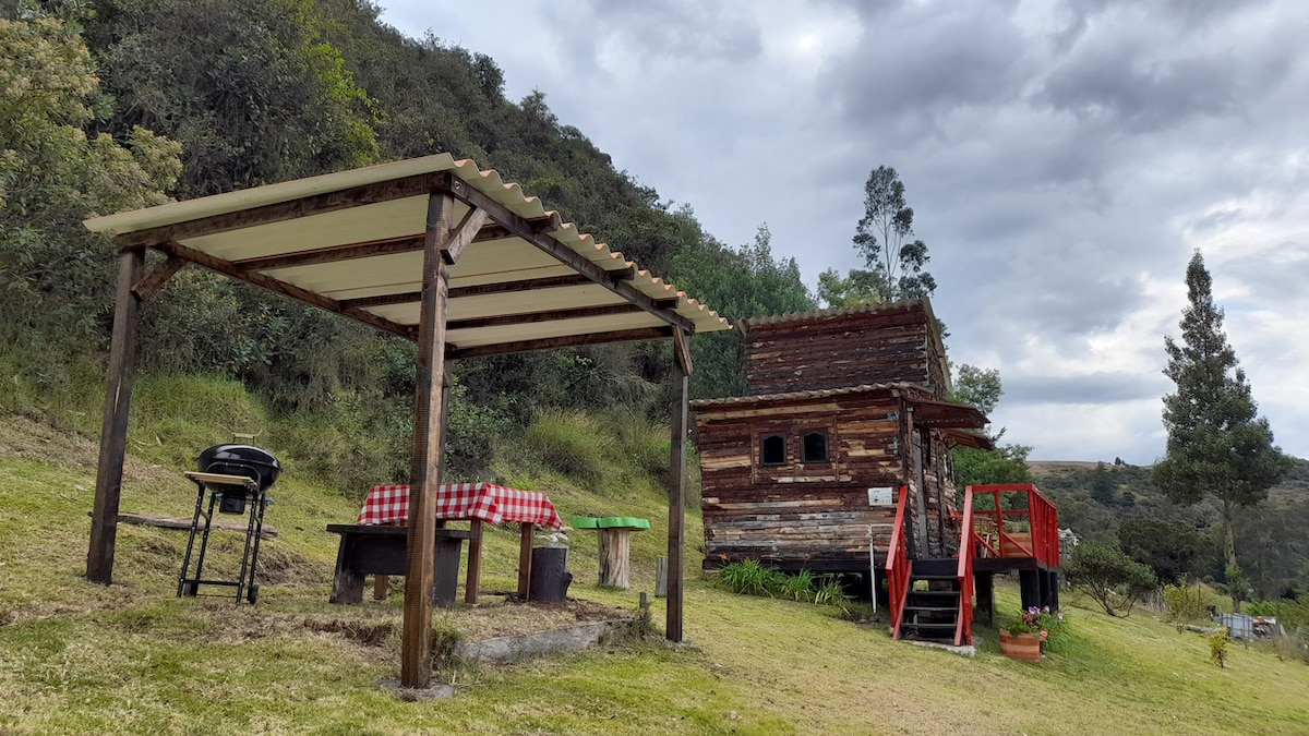 casita en la montaña,mini casa de 12mts cuadrados con vista directa al mitico cerro LAS TRES VIEJAS lugar donde transitaron los Muiscas y se desarrollo la leyenda del dorado, un espacio diseñado para desconectarte del ruido y reconectar con la naturaleza la historia y la tranquilidad absoluta,disfruta de un mirador360 con vista a las majestuosas montañas, también una minicasita al revés para la mejor foto y recuerdo de tu estadía, a tan solo una hora de Bogotá, lugar perfecto para una escapada.