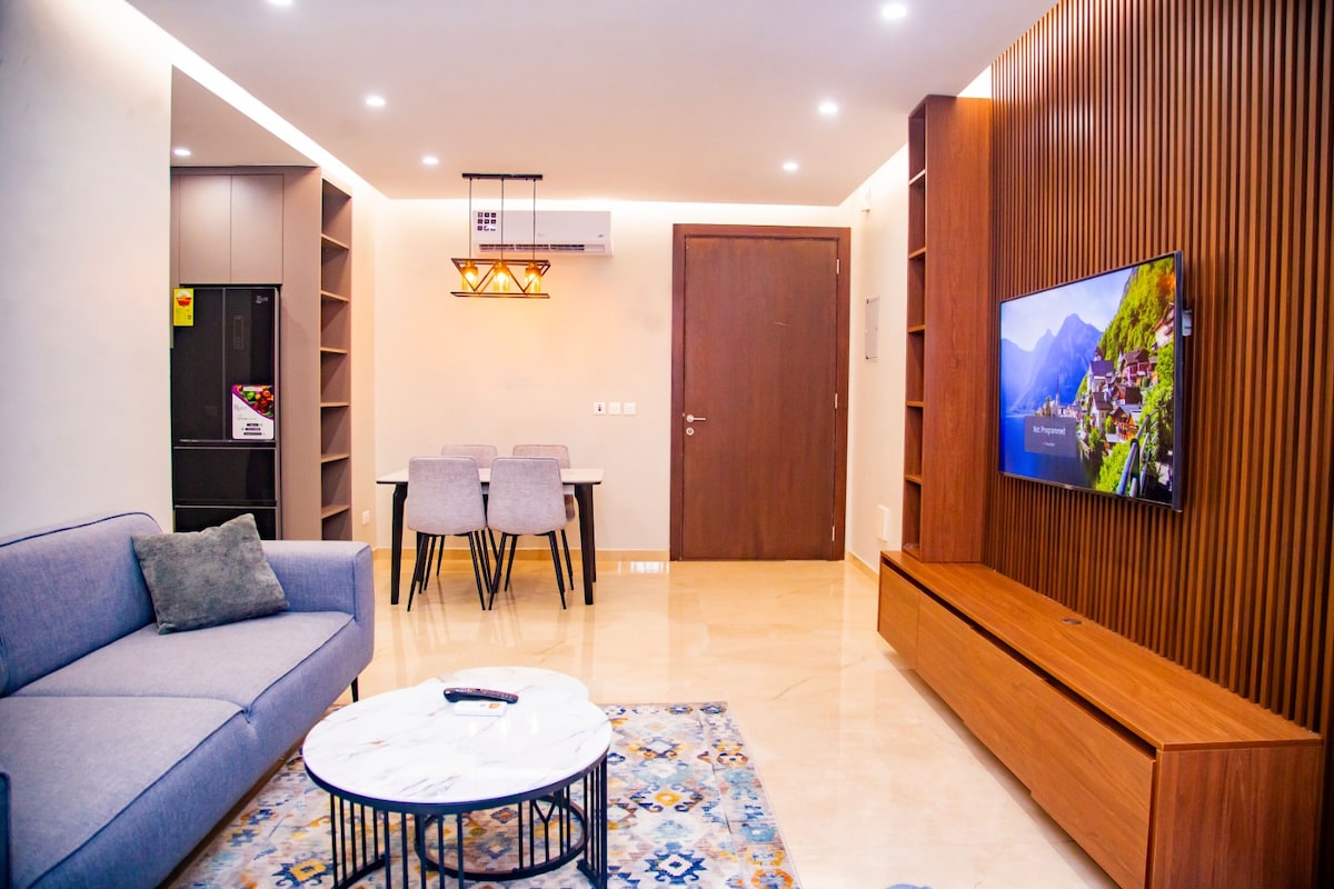 Akkrada qısa və uzun müddətli qonaqlamalar üçün ideal olan Kingsize çarpayıları olan möhtəşəm və geniş 2 yataq otağı olan mənzil. Mənzil Netflix, pulsuz yüksək sürətli Wi-Fi, hər otaqda və mətbəxdə AC ilə tam təchiz olunub. Qonaqlar üçün döşəkağı və dəsmallar mövcuddur. Bütün məkan ayrıca, geniş və rahatdır, həmçinin xüsusi təhlükəsizliyi olan çox gözəl və dəbli məhəllədə yerləşir. Supermarketlər və apteklər yalnız küçədə yerləşir. Qəhvə dükanları və restoranlar 2 dəqiqəlik məsafədə yerləşir. Hava limanı 10 dəqiqəlik məsafədə.