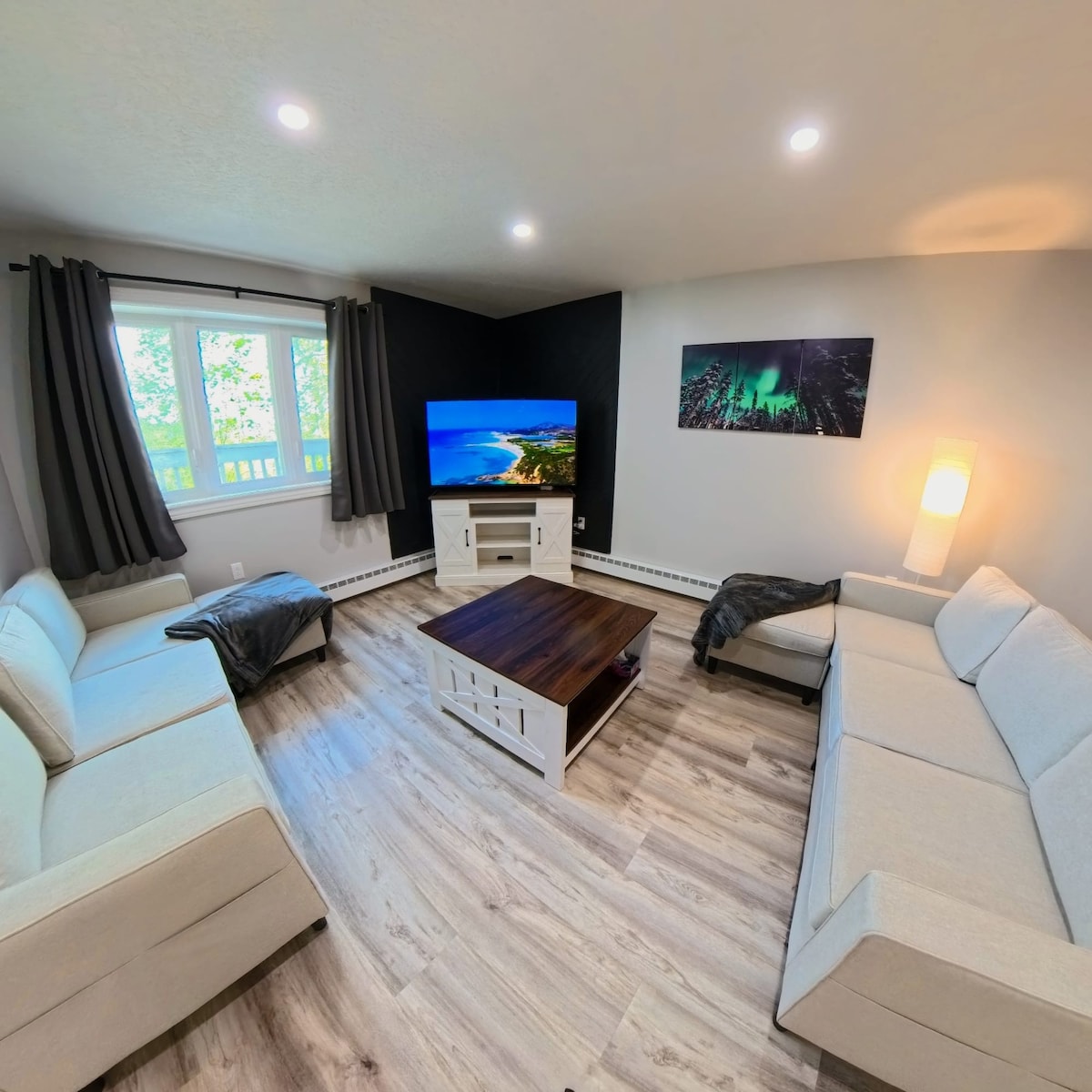 Welcome to The Woodhaven House, a warm three-bedroom retreat where the land and light do the storytelling. Tucked on 49th Street, this upper level suite blends nature’s calm with downtown convenience. Out back, the rock garden feels like a hidden world for slow mornings, vibing and/or Aurora nights. The Woodhaven House is also conveniently located in close proximity to tour companies and easy tour pickups. The downtown core sits at your doorstep, but inside, it’s all peace, warmth, and ease.