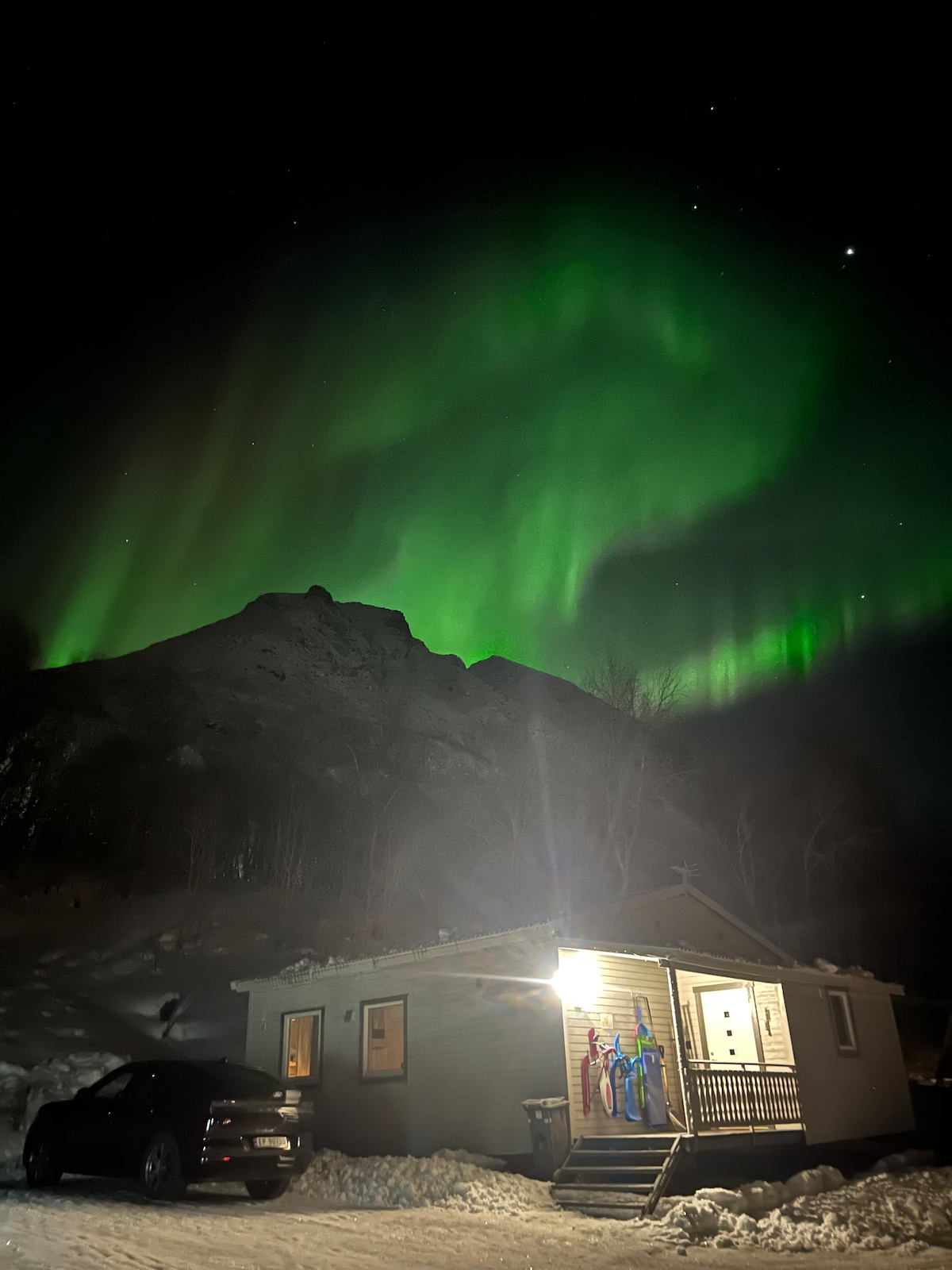 Bu kiçik qonaq evi birbaşa mətbəx və yataq otağının pəncərəsindən ən gözəl mənzərəyə sahibdir. Ətrafda küçə işıqları olmadığına görə Auroranı seyr etmək və Arktikada rahat xüsusi tətildən zövq almaq üçün mükəmməl yerdir. 6 yaşlı oğlumuz və pişiyimizlə birlikdə qapının yanında yaşayırıq. Saat 20:00 -dan etibarən təxminən saat 16:30 -dan etibarən və həftə sonları evdə oluruq. Yerində xidmətlər: EV şarjı 400kr/ Xüsusi köçürmə 500kr/Cakuzi 1200kr və ya 2 gün üçün 100 €/Sauna 500kr və ya hər istifadə üçün 40EUR (yalnız nağd pul)