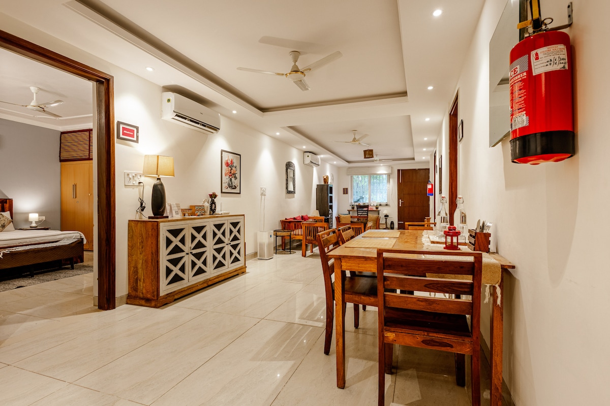 Welcome to Golfgreens, Saket. A luxurious, spacious and sun-lit 4-bedroom ground-floor Airbnb in prime South Delhi. Located 3 minutes from Malviya Nagar Metro, PVR Saket and Select City / DLF Avenue Malls. 4 en-suite bedrooms with king-sized beds, attached baths, air conditioning, heaters, air purifiers, smart TVs and premium linen. Relax in the sunny living room, full kitchen with dining, and private garden — your own quiet oasis in the city, with hotel-style service.