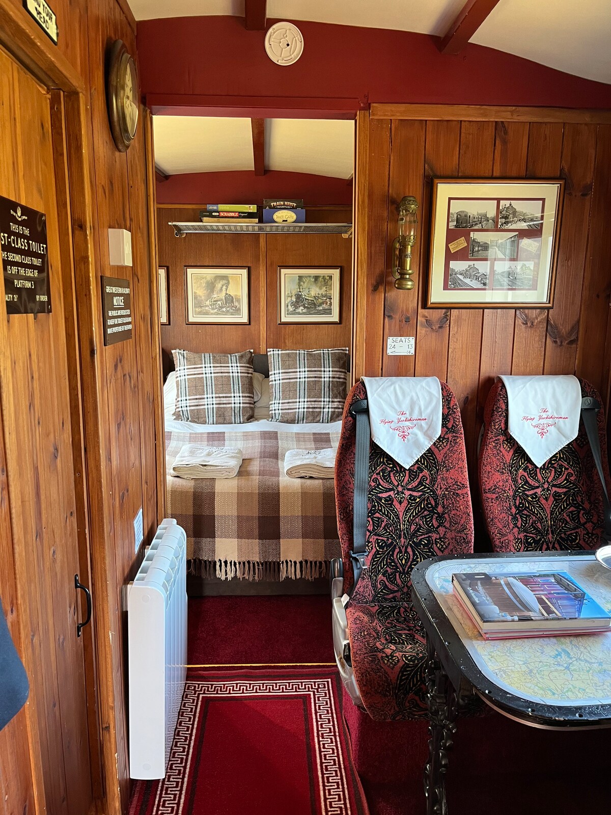 Pullman üslublu bu dəmiryolu vaqonunu tikmişik və fermadan keçən köhnə Nidd Vadisi dəmiryolu xəttinə baxaraq onu görmüşük. Onun ölçüsü 24x9 futdur, duş, tualet, mətbəx, istilik sistemi və qonaqlama üçün lazım olan hər şey var. Dörd tutacaq, baqaj rəfi, lampalar, işarələr və daha çoxu daxil olmaqla bir çox dəmir yolu elementlərini bərpa etmişik. O, ola biləcəyi qədər səmimidir. Çöldə gözəl Deyls mənzərəsi, üstü açıq odunla qızdırılan cakuzi, oturacaq və masa var.